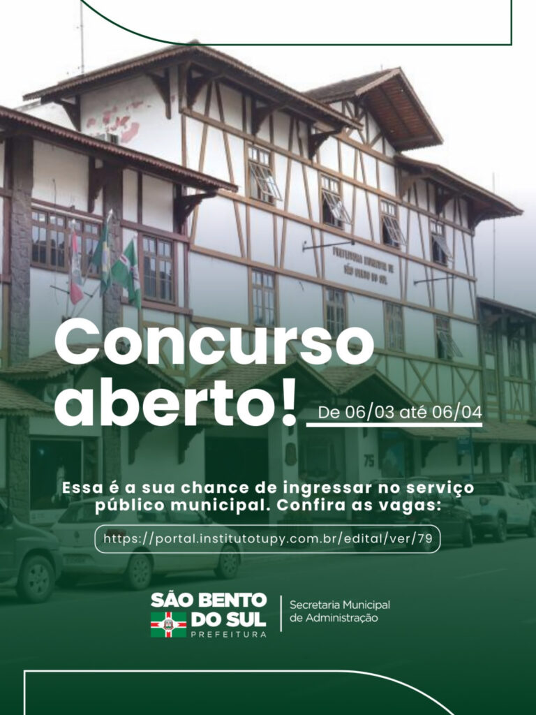 A Prefeitura de São Bento do Sul, em Santa Catarina, publicou o Edital 001/2026 de Concurso Público, destinado a preencher vagas em caráter efetivo e a formar cadastro de reserva para diversos cargos do quadro de pessoal do Município, da Fundação Municipal de Desportos, da Empresa Municipal de Habitação, da Fundação Cultural e do Instituto de Previdência Social dos Servidores Públicos. As oportunidades abrangem os níveis de fundamental incompleto e completo, médio, técnico e superior.