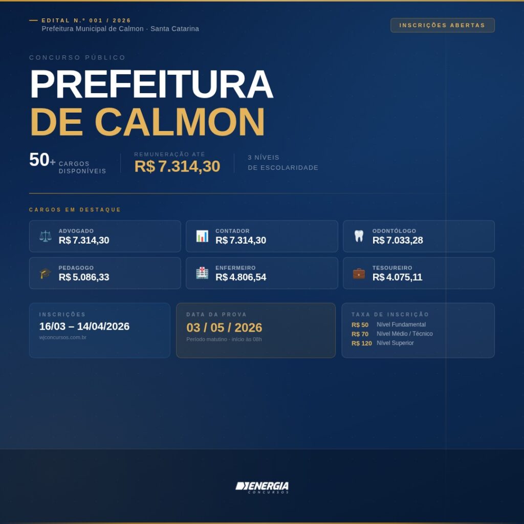 O município de Calmon, em Santa Catarina, publicou o edital nº 001/2026 para a realização de concurso público, sob organização da banca WJ Concursos. A seleção contempla oportunidades para candidatos de níveis fundamental, médio/técnico e superior, com salários que chegam a R$ 7.314,30, dependendo do cargo e da carga horária.